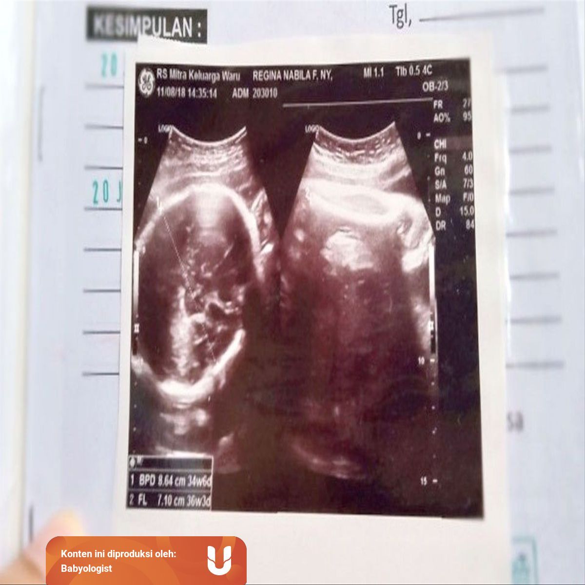 Hasil USG saya saat itu. Biparietal diameter is used to estimate fetal weight and gestational age. 834 34w0d FL.